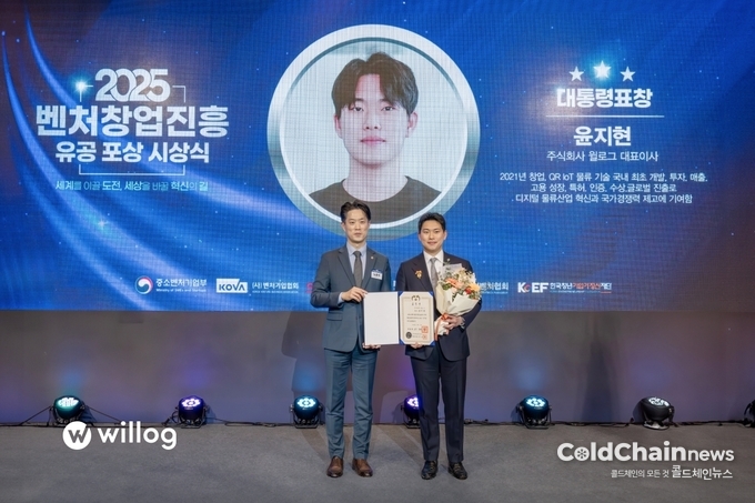 AIoT기반 공급망 인텔리전스 솔루션기업 윌로그(배성훈, 윤지현 각자대표)는 12월10일 코엑스에서 개최된 ‘2025 벤처창업진흥유공 포상’ 시상식에서 대통령표창을 수상했다고 밝혔다.