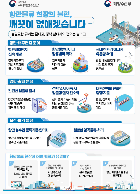 규제혁신추진단(단장 한덕수)과 해양수산부(장관 조승환)는 5월12일 항만물류분야 규제합리화를 통한 수요자 편의증진 방안을 마련해 규제개혁위원회에 보고하며 시행키로 했다고 밝혔다.