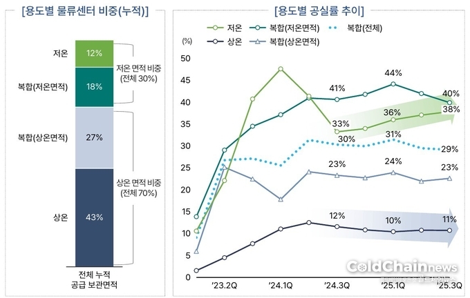 보고서는 급격한 공급과잉시기를 지나면서 저온 단일형 물류센터보다 상온·저온 복합물류센터 비중 확대가 두드러지고 있다고 분석했다. 건설비 상승과 사업성 확보부담으로 인해 신규 물류센터의 저온면적비중은 전체의 약 30% 수준으로 조정되고 있는 추세이며 복합센터 내 저온·상온 혼합설계가 일반화되고 있다.