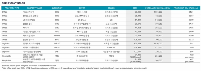 한편 2025년 4분기 전체 상업용 부동산 거래는 총 29건, 약 7조8,000억원으로 집계됐으며 연간 거래액은 25조4,000억원으로 전년대비 약 23% 증가해 역대 최대규모를 기록했다.