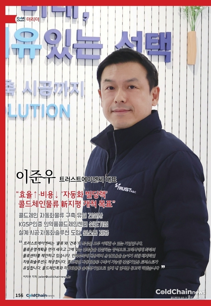 트러스트는 ‘2025 푸드위크 코리아’에서 ‘자동화빌딩랙(Automated Building Rack)’ 모형을 공개하며 식품기업 및 물류 관련업계에서 큰 주목을 받았다. 상온물류 에서만 가능할 것이라고 여겨졌던 자동화 시스템 구축이 콜드체인물류에서도 가능하다는 것을 선보이며 업계 이목을 끌었다. 이준우 트러스트 대표를 만나 콜드체인물류 특화 자동화솔루션과 업계현황에 대해 들 어봤다.