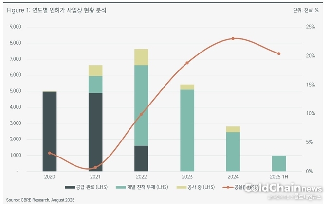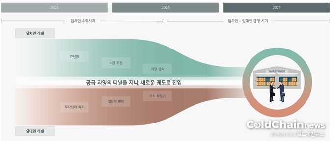 보고서에 따르면 공급과잉으로 급등했던 수도권 A급 물류센터시장 공실률은 2024년을 정점으로 하향전환하며 시장안정화의 초기국면에 진입하고 있다. 누적된 미착공물량과 인허가 리스크, 어려워진 자금조달환경 등을 고려할 때 중단기적으로 신규공급이 회복되기는 쉽지 않을 것이라는 전망이다.