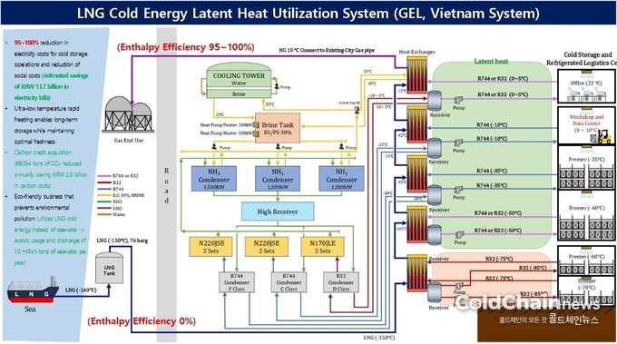 지이엘은 이번 베트남 프로젝트에서 LNG냉열 60톤을 회수해 콜드체인설비에 공급하는 설계를 적용했다. 설계기준에 따르면 해당 냉열량은 약 3,600RT급 냉동능력에 준하며 이중 약 3,000RT를 유효부하로 사용하는 고효율시스템이다. 이를 통해 연간 전기요금을 약 183억원 수준에서 57억원으로 줄여 기존대비 약 31%인 126억원의 비용을 절감할 수 있다. 또한 동일조건에서 연간 CO₂배출량을 10만6,638톤에서 2만2,192톤 수준으로 낮출 수 있는 것으로 예측되고 있다. 약 8만4,400톤의 CO₂를 줄일 수 있는 것으로 분석되며 이는 대규모 산림조성 사업에 준하는 효과다.