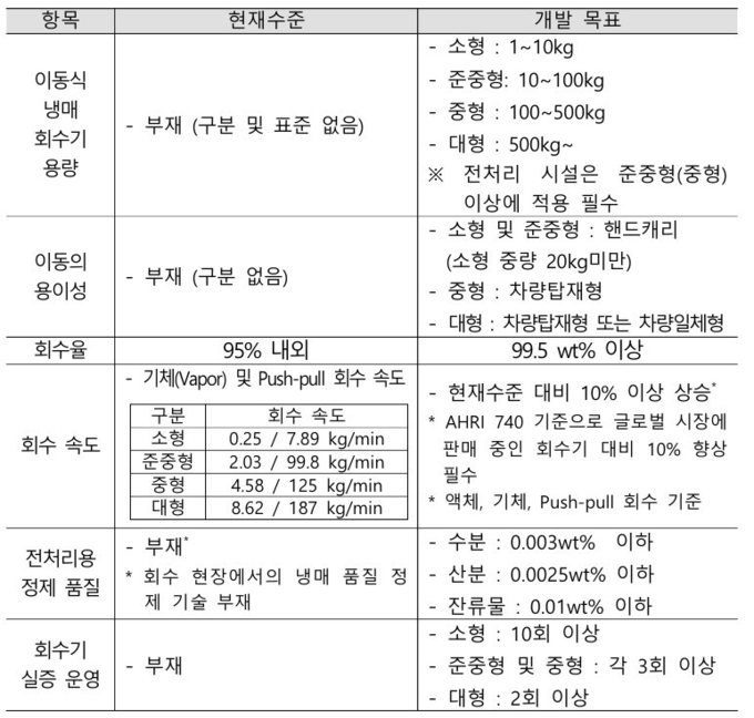 세부개발 대상기술로는 △고(高) 회수율 및 회수속도의 이동식 냉매회수기 △냉매회수기와 연계 가능한 전처리용 정제기술 △냉매회수기용 ICT기반 실시간 연동시스템 기술 △회수기의 성능 평가 기준 등이 제시됐다.