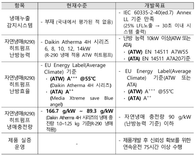 성과목표는 SCI, SCIE 논문 5건 이상 발표 등의 과학적 성과와 누출 감지 요소기술, 자연냉매 히트펌프 및 리스크평가 관련 등 국내 특허등록 7건 이상의 기술적 성과 등이 제시됐다. 기술이전 2건 이상의 사회적 성과도 목표다.