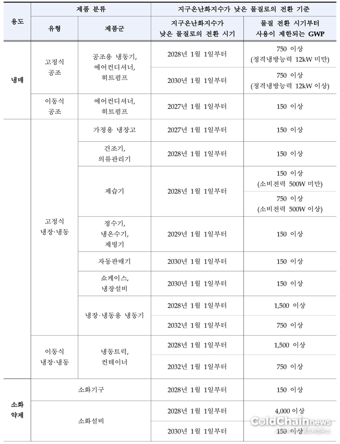 냉동기와 냉동트럭, 컨테이너 등 물류·산업용 냉동설비는 두 단계에 걸쳐 기준이 강화된다. 2028년부터는 GWP 1,500 이상 냉매사용이 제한되며 2032년부터는 기준이 750으로 더욱 강화된다. 저온·대용량 냉동설비의 기술적 특성과 대체냉매 상용화 속도를 반영한 것으로 냉동물류산업이 점진적으로 친환경냉매체계로 전환하도록 유도하는 것으로 보인다.