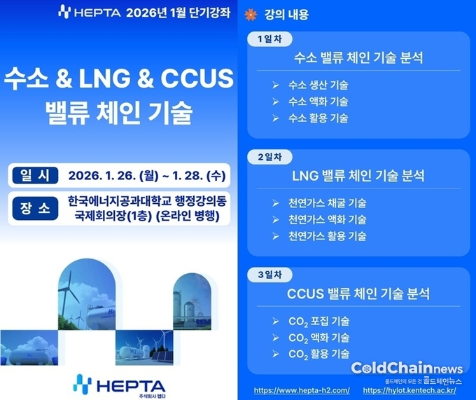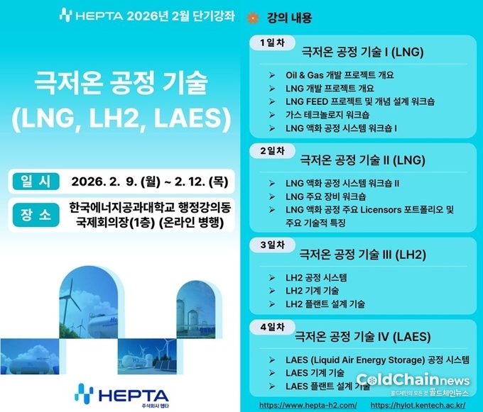 2월 ‘LNG, LH2, LAES 등의 극저온 공정기술’ 강좌는 2월6일 금요일까지 모집한다. 수강료는 일반인 40만원, 학생 20만원이다.