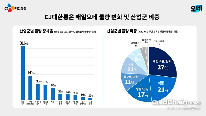 CJ대한통운은 1월19일 ‘매일오네’ 도입 첫 해인 2025년 데이터를 분석한 결과 지난해 12월 일요일 배송물량이 연초대비 67% 증가했다고 밝혔다. 경기불황으로 인한 소비심리 위축에도 끊김없는 배송서비스를 구축한 성과를 거두며 소비자생활과 이커머스업계에 변화를 가져오고 있는 것으로 풀이된다.