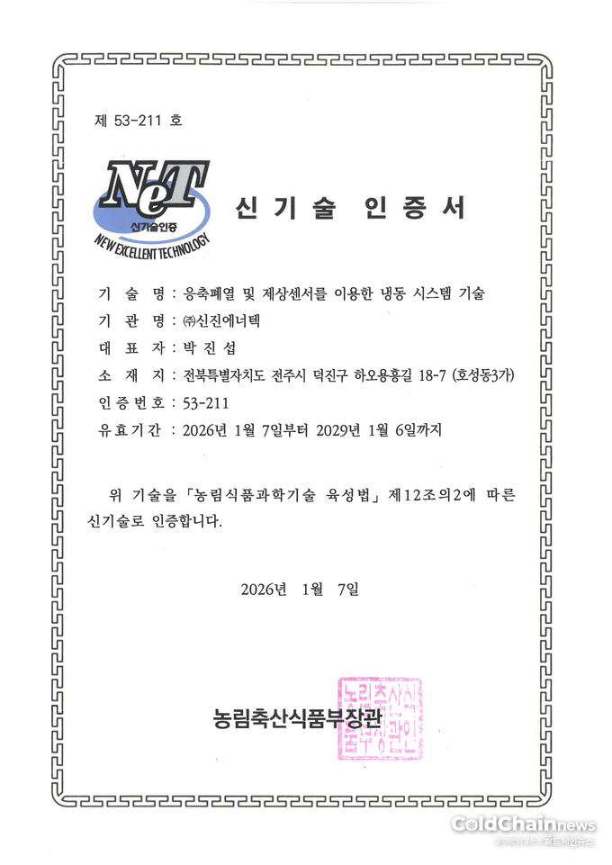 신진에너텍(대표 박진섭)은 최근 ‘응축폐열 및 제상센서를 이용한 냉동시스템 기술’로 농림축산식품부 신기술인증(NET)을 획득하며 친환경 냉동기술 선도기업으로서 위상을 공식 인정받았다고 밝혔다.