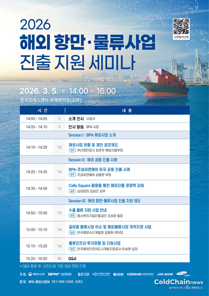 부산항만공사(BPA, 사장 송상근)는 오는 3월5일 한국프레스센터 국제회의장에서 ‘2026 해외 항만·물류사업 진출 지원세미나’를 개최한다고 밝혔다.